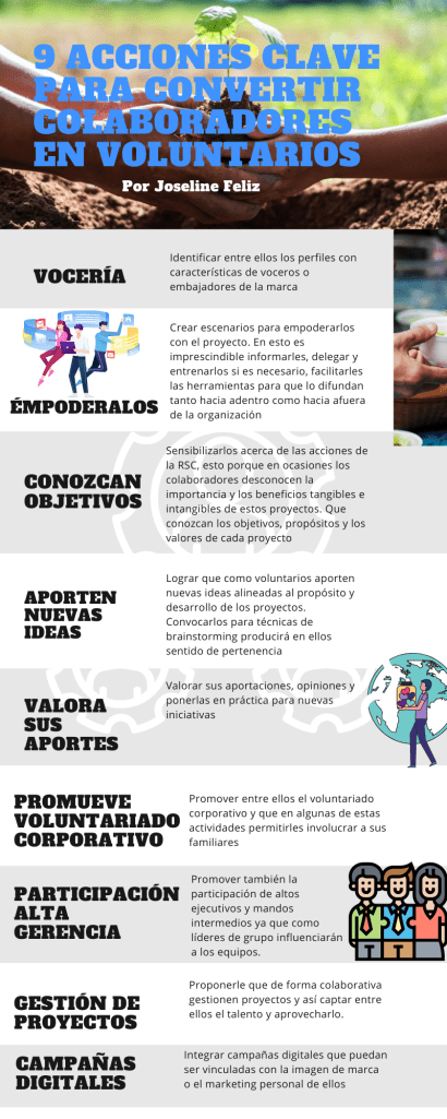 - Sensibilizarlos acerca de las acciones de la RSC, esto porque en ocasiones los colaboradores desconocen la importancia y los beneficios tangibles e intangibles de estos proyectos. Que conozcan los objetivos, propósitos y los valores de cada proyecto.