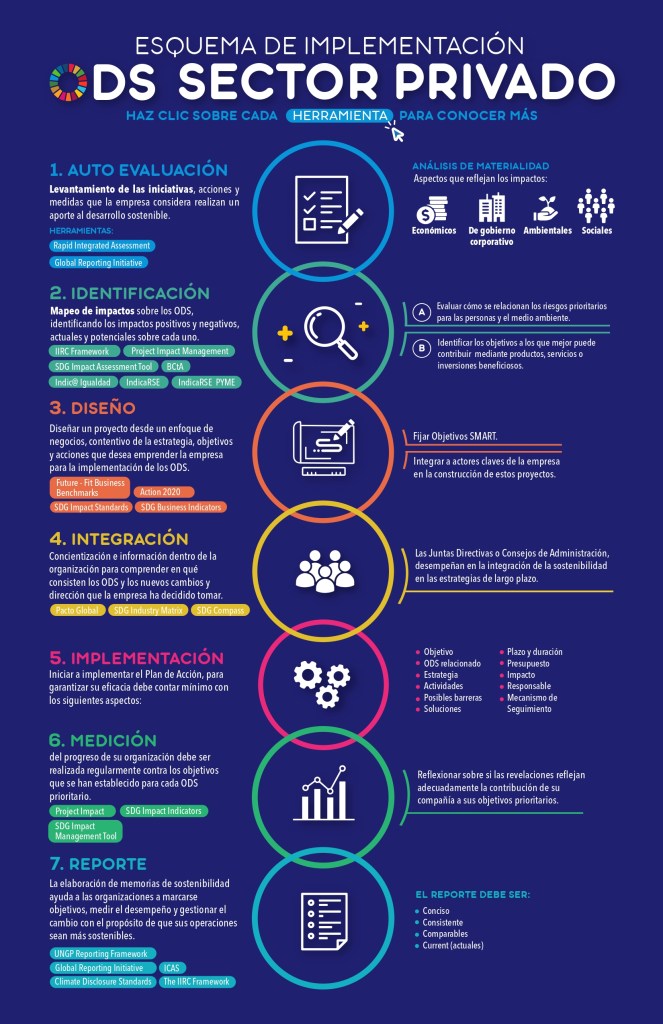 Aquí te dejamos la infografía, la cual está linkeada a diferentes herramientas que te permitirán ajustar los ODS y utilizarlos como un mapa para lograr el triple impacto.